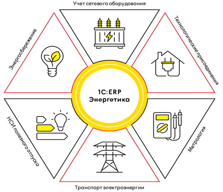 1. «1С:Предприятие 8. ERP Энергетика» — управление ключевыми бизнес‑процессами распределения электроэнергии и одновременный учёт в одной информационной базе (управленческий и регламентированный);